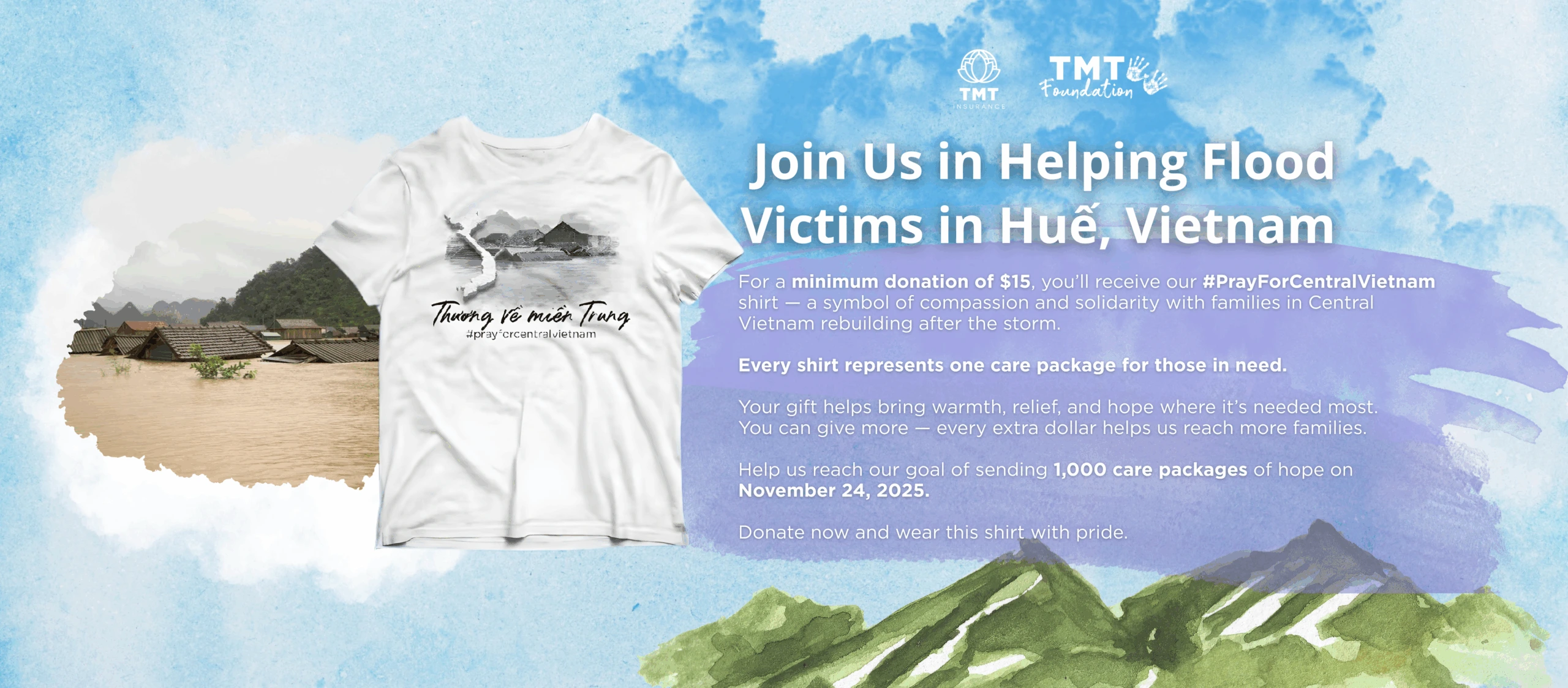 For a minimum donation of $15, you’ll receive our #PrayForCentralVIetnam shirt — a symbol of compassion and solidarity with families in Central Vietnam rebuilding after the storm.