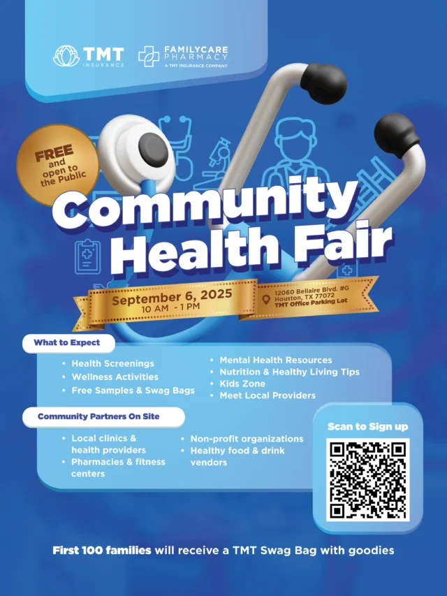 Tổ chức bởi: TMT Insurance & Family Care Pharmacy:date: Thứ Bảy, ngày 6 tháng 9, 2025 | 10:00 sáng – 1:00 trưa